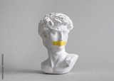 Michelangelo's David head bust in duct tape sealed mouth. Minimal concept on gray background censorship of freedom of speech and restrictions of thought and word. Fight for your rights.
