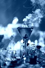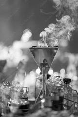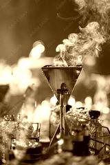 Oud (Agar wood chips with musky scent) burning in a gold Mabkhara (censer) on a table with perfume bottles and Baby's Breath at an Arabic wedding.