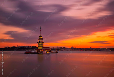 Istanbul, Turkey. Sunset over Bosphorus with famous Maiden's Tower (Kiz Kulesi) symbol of Istanbul, Turkey. Scenic travel background.