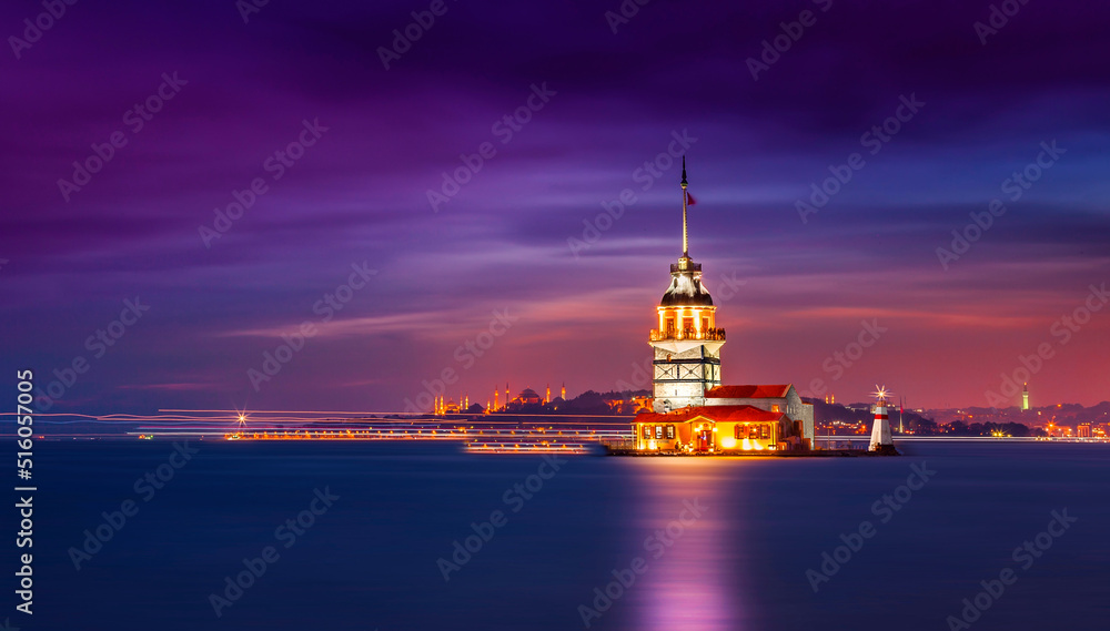 Istanbul, Turkey. Sunset over Bosphorus with famous Maiden's Tower (Kiz Kulesi) symbol of Istanbul, Turkey. Scenic travel background.