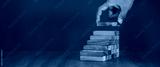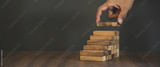 Hand placing wooden block tower stack in pyramid stair step with caution to prevent collapse or crash concepts of financial risk management and strategic planning and business challenge plan.