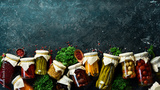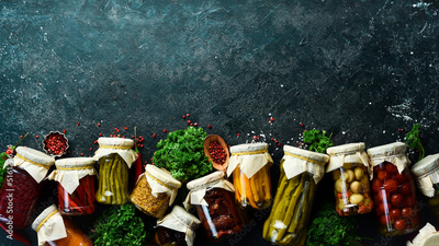Vegetables in jars. Salting various vegetables in glass jars for long-term storage. On a stone background. Top view.