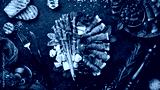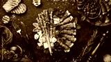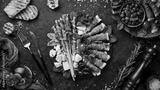 Italian ingredients: ham, prosciutto, salami, parmesan, olives, bread sticks. On a black stone background.