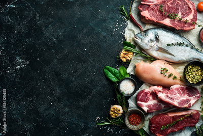 Various protein sources concept - rib eye, dorado, pork, egg. Top view. On a black stone background.