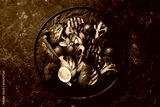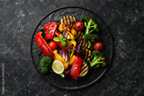 Grilled vegetables (colorful bell pepper, zucchini, eggplant, cherry tomatoes and broccoli) on a black stone plate. Top view. Rustic style.