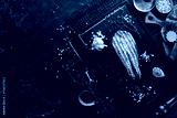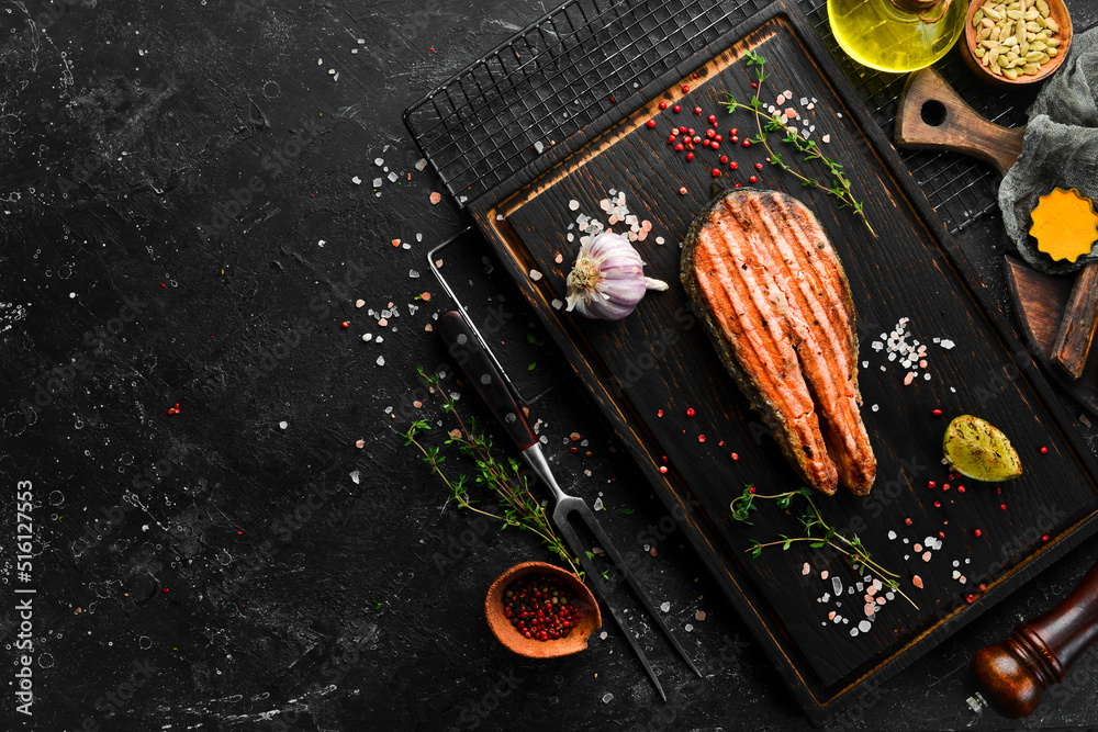 Fresh cooked delicious salmon steak with spices and herbs baked on a black board. Top view with space for copying text.