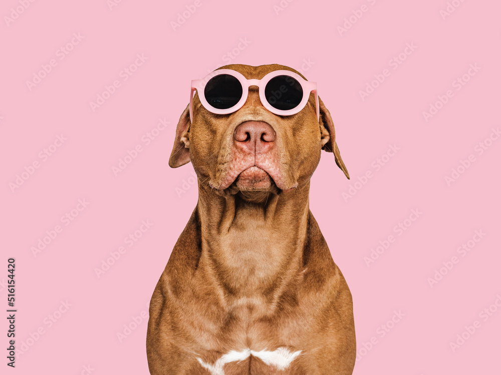 Lovable, pretty brown puppy and sunglasses. Closeup, indoors. Studio shot. Congratulations for family, relatives, loved ones, friends and colleagues. Pets care concept