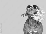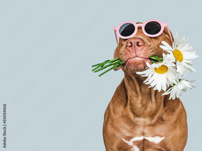 Lovable, pretty brown puppy and sunglasses. Closeup, indoors. Studio shot. Congratulations for family, relatives, loved ones, friends and colleagues. Pets care concept