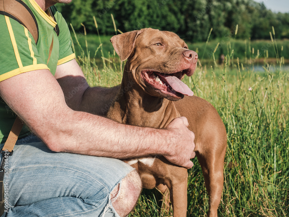 Charming, pretty brown puppy and attractive man. Close-up, outdoors. Day light. Concept of care, education, obedience training, raising pets