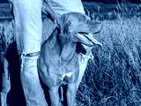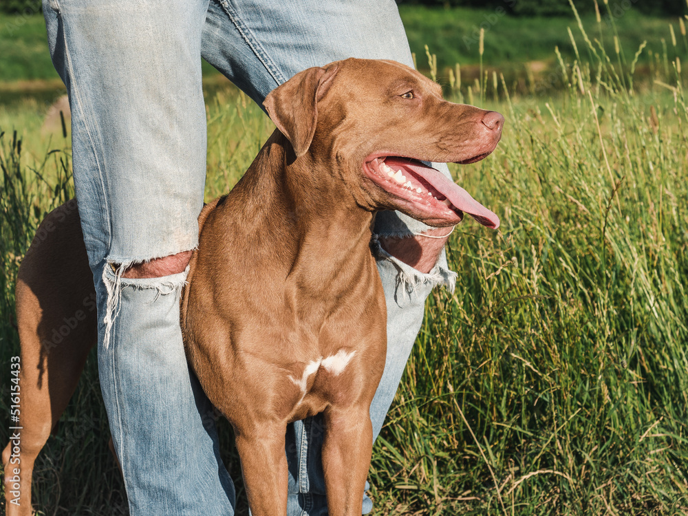Charming, pretty brown puppy and attractive man. Close-up, outdoors. Day light. Concept of care, education, obedience training, raising pets