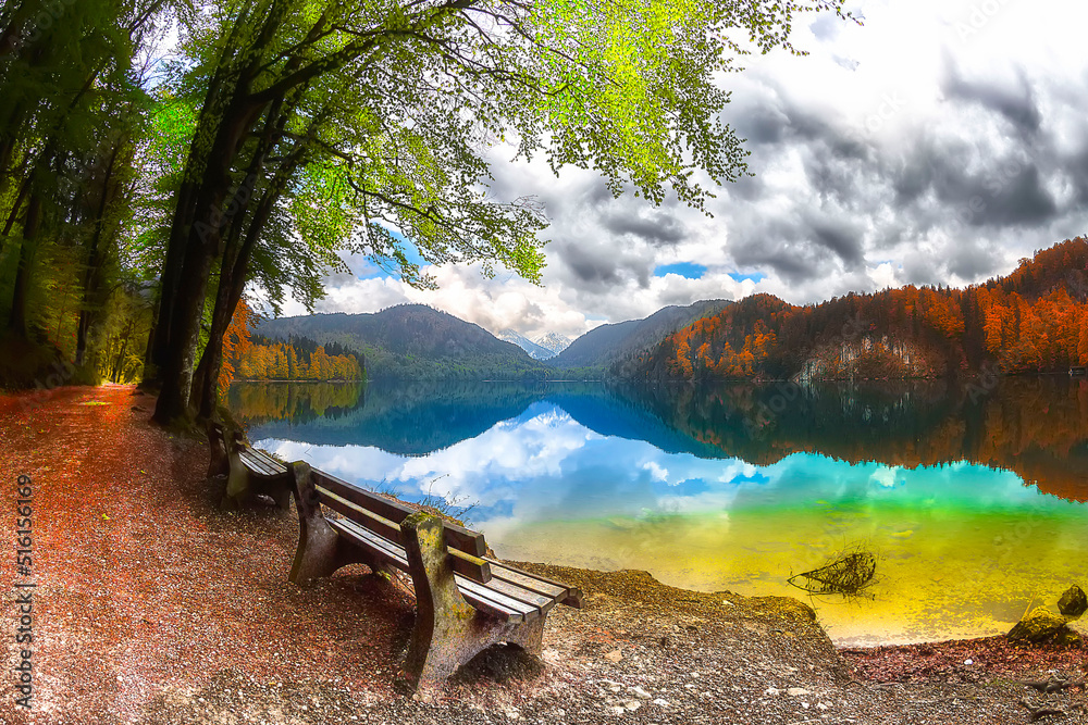 Beautiful view of world-famous Neuschwanstein Castle, the nineteenth-century Romanesque Revival palace built for King Ludwig II on a rugged cliff near Fussen, southwest Bavaria, Germany