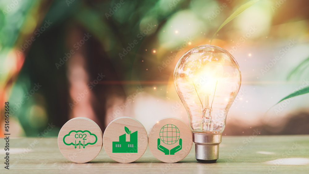 Light bulbs and wooden blocks are placed on a table and there is a natural green background.