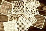 Various plastic stencils on table. Accessories and tools of the artist for drawing. Creativity and handcraft concept.
