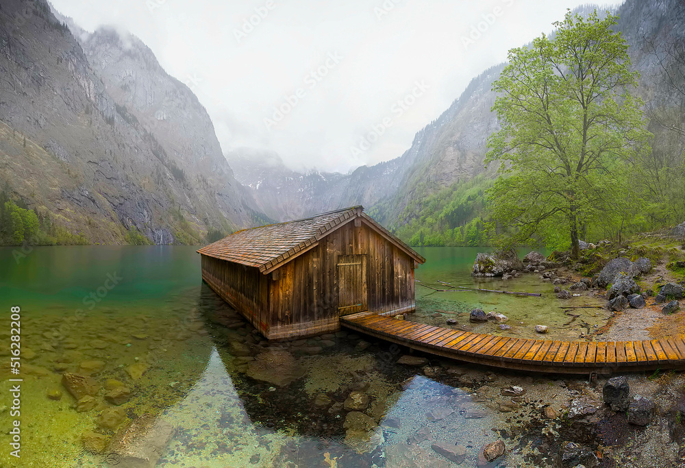 Schonau am Konigsee, Germany. Obersee lake in Berchtesgadener National Park. Watzmann mountain in the background.