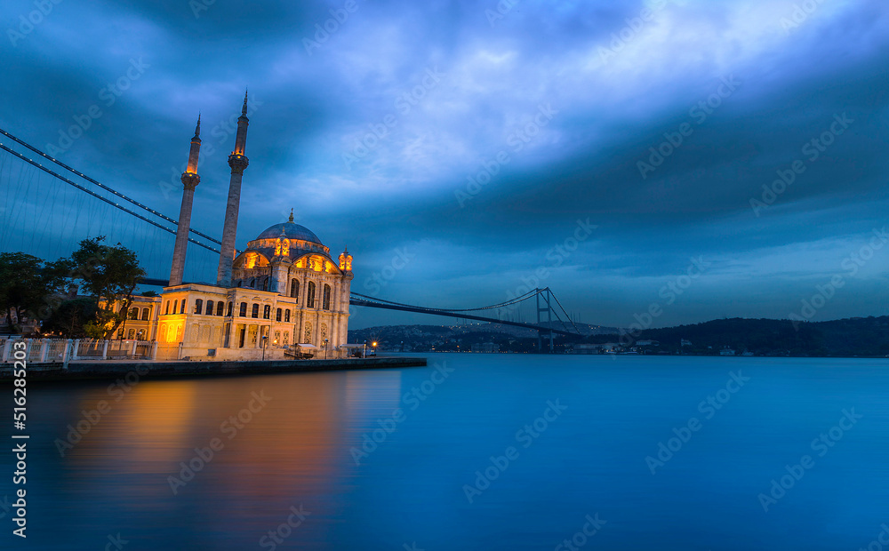 Ortakoy Mosque and Bosphorus bridge in Istanbul at sunrise, Turkey