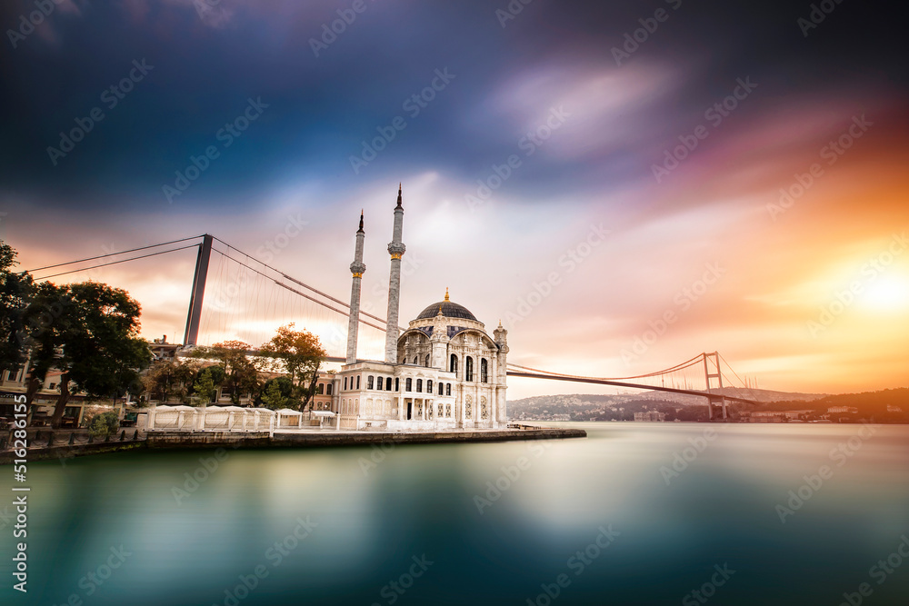 Ortakoy Mosque and Bosphorus bridge in Istanbul at sunrise, Turkey