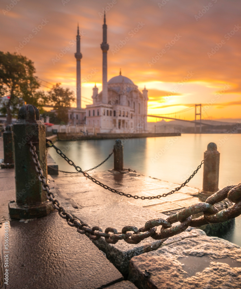 Ortakoy Mosque and Bosphorus bridge in Istanbul at sunrise, Turkey