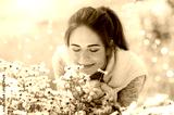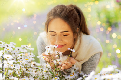 gardening and people concept - close up of happy young woman smelling chamomile flowers at summer garden