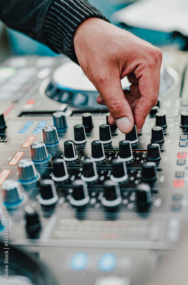 DJ Hands creating and regulating music on dj console mixer in concert outdoor