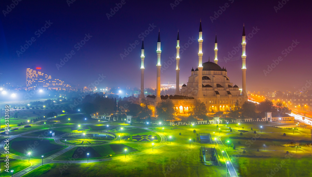 Sabancı Merkez Camii (English: Sabancı Central Mosque) in Adana, Turkey. The mosque is the second largest mosque in Turkey and the landmark in the city of Adana