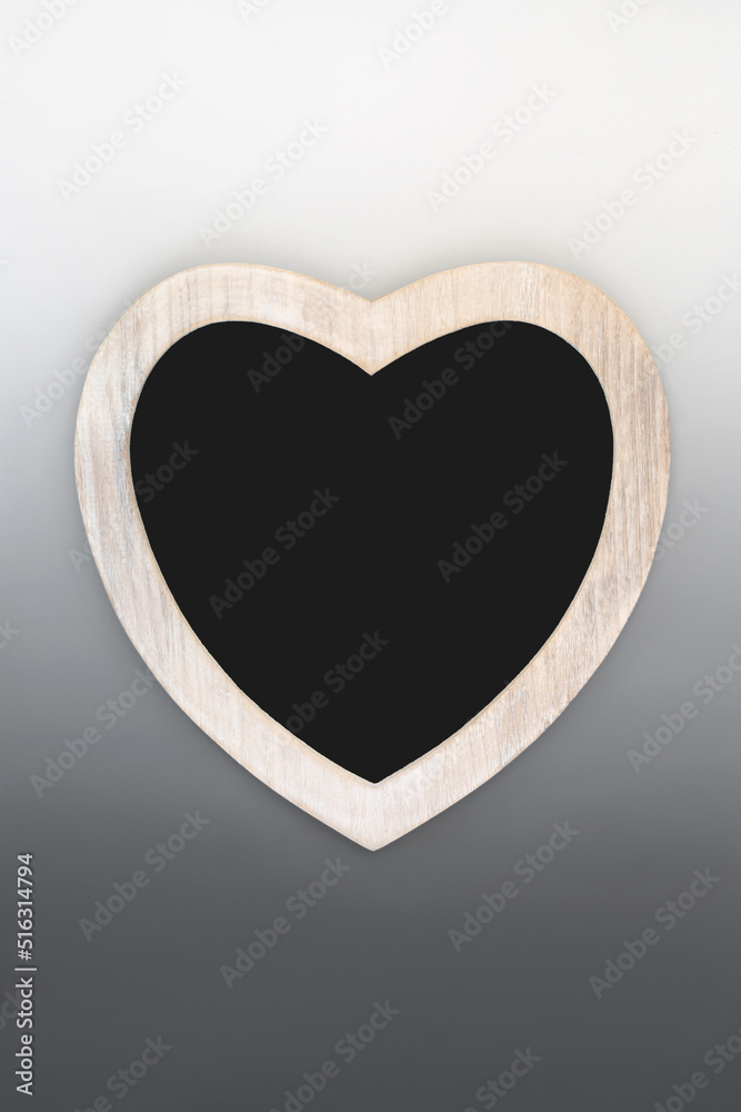 Heart shaped wooden frame with chalkboard on gradient grey background. Symbol of love for Valentines Day, Mothers Day concept, invitation, menu or classroom teaching equipment.