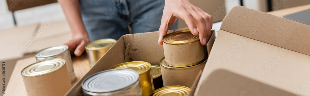 cropped view of african american volunteer packing canned food in box in charity storehouse, banner.