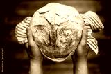Traditional leavened sourdough bread in baker hands on a rustic wooden table. Healthy food photography