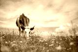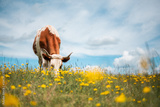 Brown cow on blossom field with yellow flowers. Pasture with lush green grass and blue sky background