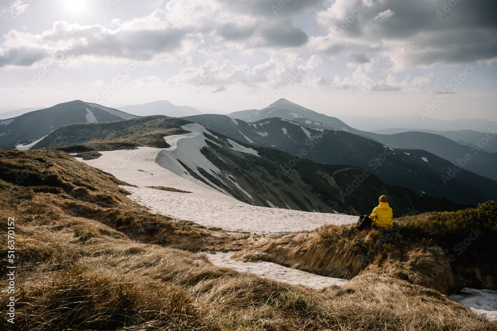 A tourist sits on the edge of a mountain peak. Foggy mountains on the background. Landscape photography