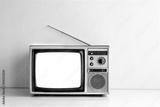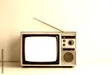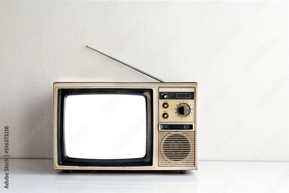 Retro old television with cut out screen on white table in front of gray wall background, front view, blank screen