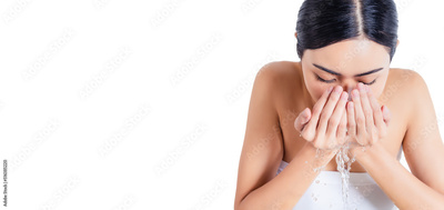 Beautiful Asian Woman washing her beauty face with pure water Young Asia girl splashing water to her beautiful facial skin in a bathroom at home Isolated on white background Copy space studio shot