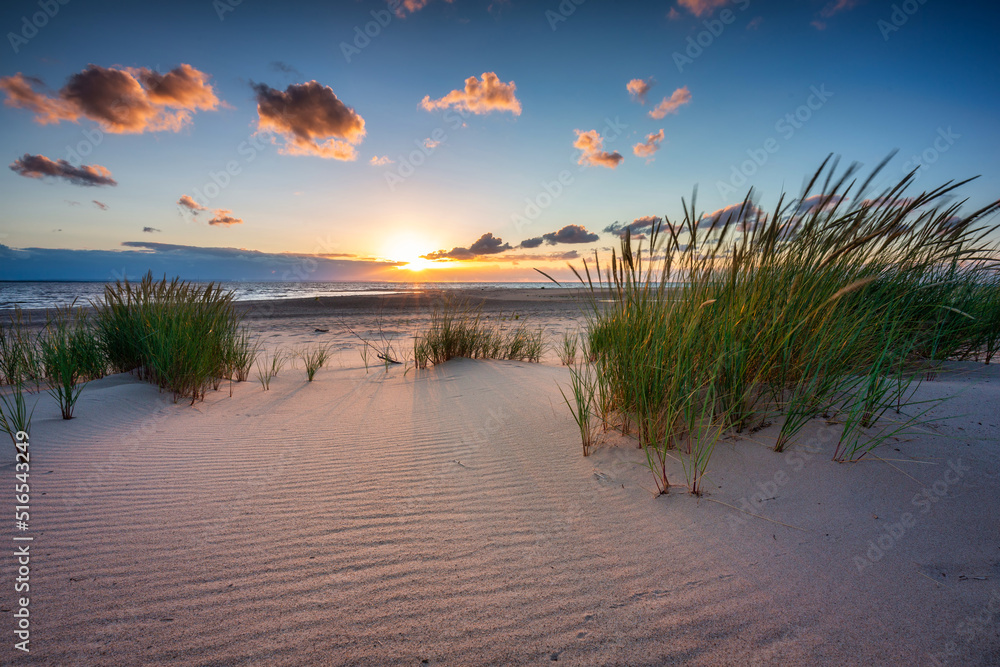 Beautiful sunset on the beach of the Sobieszewo Island at the Baltic Sea. Poland