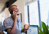 A Black fashionable businessman talks on his cellphone with takeaway coffee