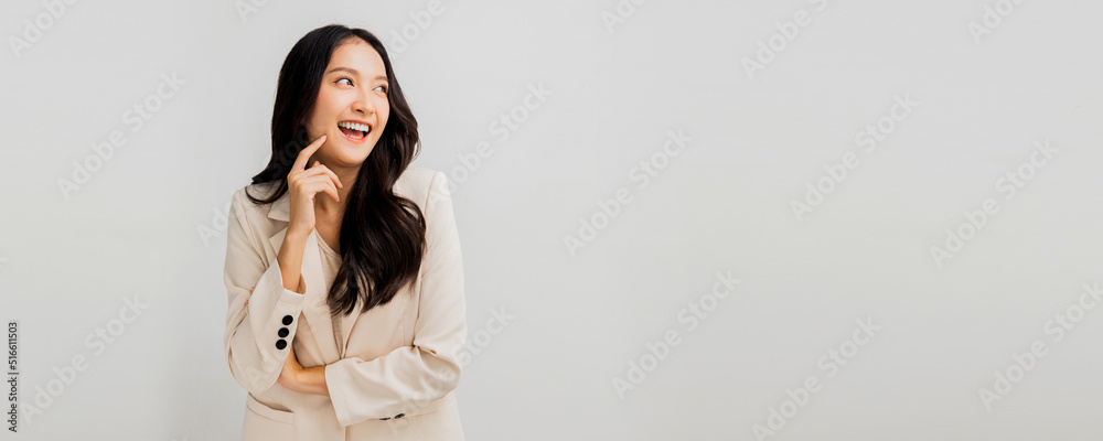 Cute and beautiful Asian confidential business woman smile, positive natural lovely Thai girl teenager in suit isolated in studio..