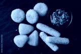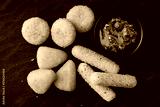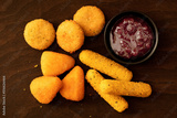 Fried breaded brie and camembert nuggets, mozzarella sticks and lingonberry sauce on dark wood from above.