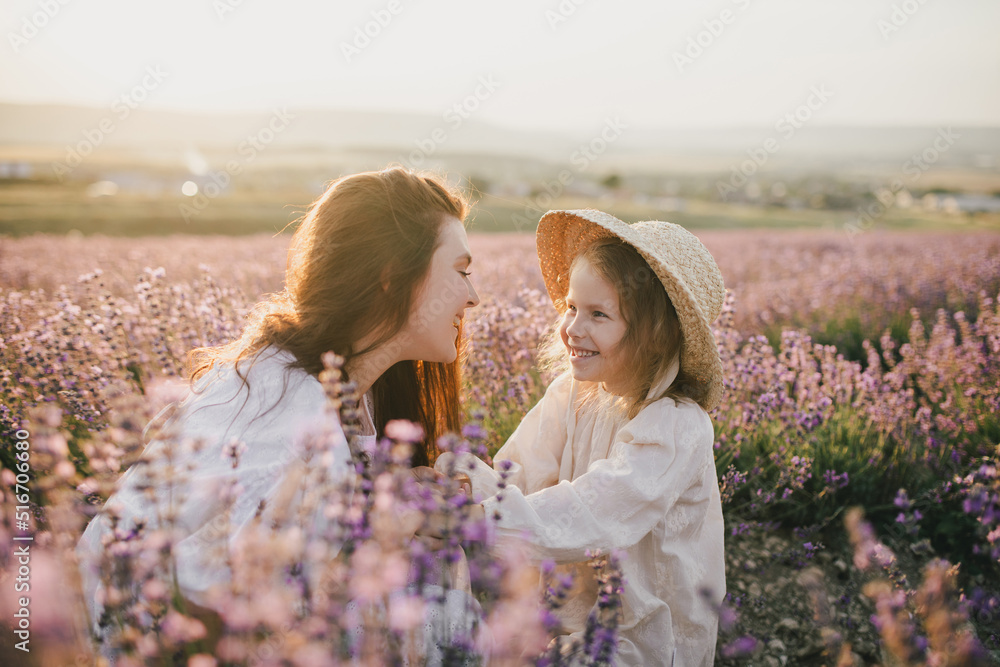 Happy mother and daughter wearing white vintage dresses having fun in lavender field at sunset.