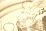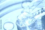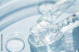 Two pipettes with transparent cosmetic liquid over blue background with copy space. Texture of face serum, hydrolate or cosmetic oil, beaty treatments. Selective focus