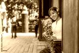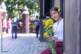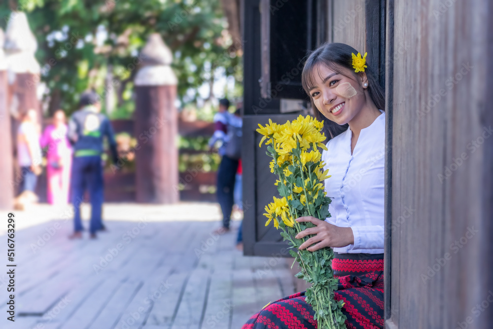 Beautiful happiness smile woman in Mandalay, Myanmar wearing traditional dressing have apply powder Thanaka powder with yellow flower close the ears in wooden palace landmark.