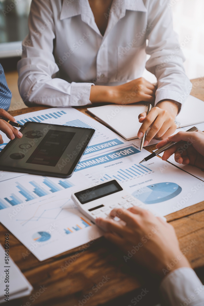 Financial analyst analysis business financial report on digital tablet during discussion at meeting of corporate showing the results of their successful teamwork, business meeting concept, Marketing