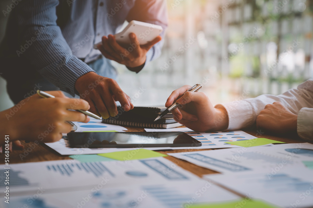 Financial analyst analysis business financial report on digital tablet during discussion at meeting of corporate showing the results of their successful teamwork, business meeting concept, Marketing