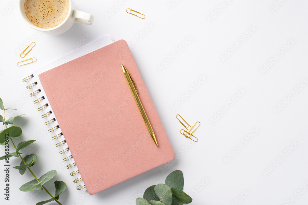 Business concept. Top view photo of workplace pink diary gold pen cup of hot drinking clips and eucalyptus on isolated white background
