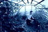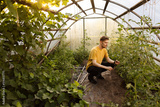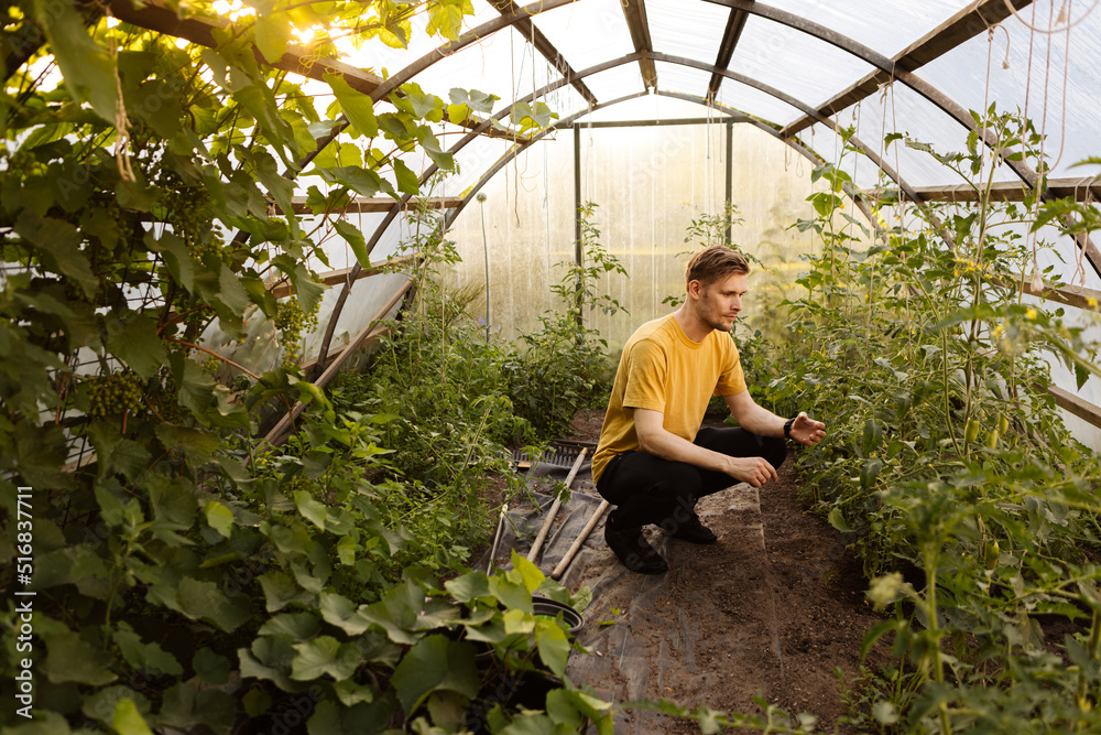 Man picking fresh vegetables from green house. Organic farmer in yellow shirt. Local food harvest from home gardening. Self sufficiency during food crisis. Autumn harvest season.
