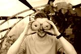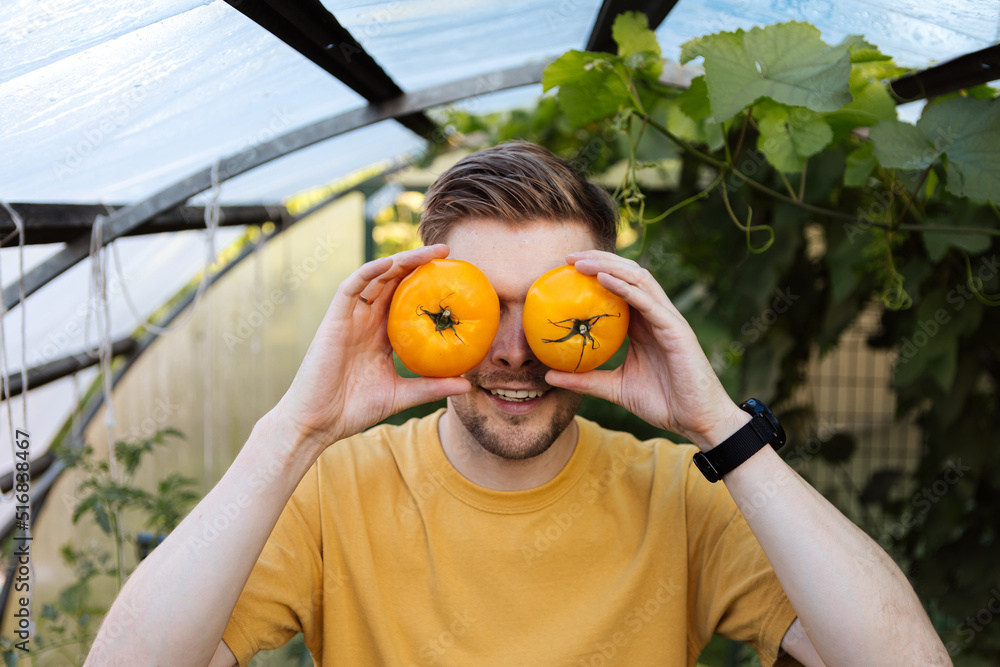 Young man holding orange tomatoes in front of his eyes. Organic farmer in green house. Male in yellow shirt. Autumn harvest season. Happy and attractive man.