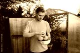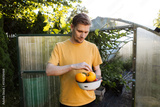 Man picking fresh vegetables from green house. Organic farmer in yellow shirt. Local food harvest from home gardening. Self sufficiency during food crisis. Autumn harvest season.