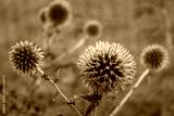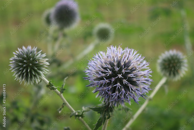 Beautiful blue flowers of Echnops in the flowerbed. Globe thistles plant in bloom on summer