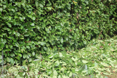 Pruned cherry laurel hedge in the garden. Pruning a Prunus laurocerasus bush