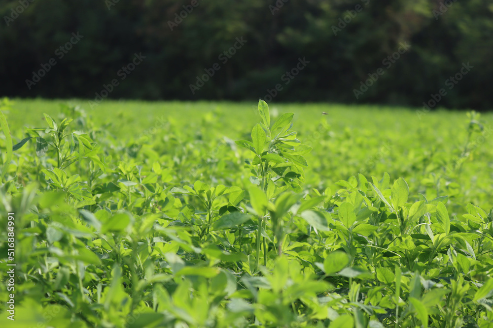 Alfalfa green plants growing in the field against sunlight on summer. Medicago sativa cultivation