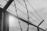 Prison security fence. Border fence. Barbed wire security fence. Razor wire jail fence. Boundary security wall. Prison for arrest of criminals or terrorists. Private area. Military zone concept.