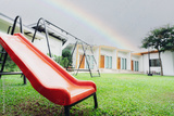 Orange slide in the playground. Playground equipment for children to play. Plastic slide at outdoor playground with green grass ground. Outdoor kids toy at park. Outdoor play equipment. Public space.