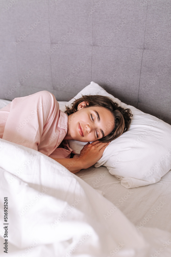 Cheerful young woman looking at camera . In white bed smiling brunette girl wearing pink pajamas lying on the bad in home. Home, relax concept